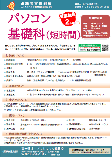 2026年4月に鶴岡校にて行われる「求職者支援訓練講座」として